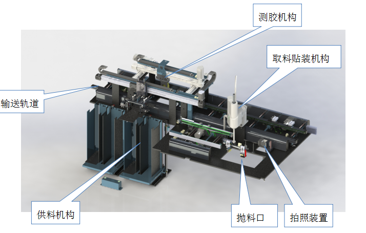 該設(shè)備主要進(jìn)行LED顯示屏模組的自動(dòng)膠干檢測(cè)與面罩的自動(dòng)貼裝。自動(dòng)測(cè)膠蓋面罩機(jī)整體可分為,控制部分、供料機(jī)構(gòu)、拍照裝置、取料貼裝機(jī)構(gòu)、輸送軌道、測(cè)膠機(jī)構(gòu)。集面罩自動(dòng)供料、面罩方向判別、NG面罩拋料、自動(dòng)抓取貼裝、與自動(dòng)測(cè)膠功能為一體的多功能設(shè)備。